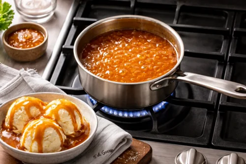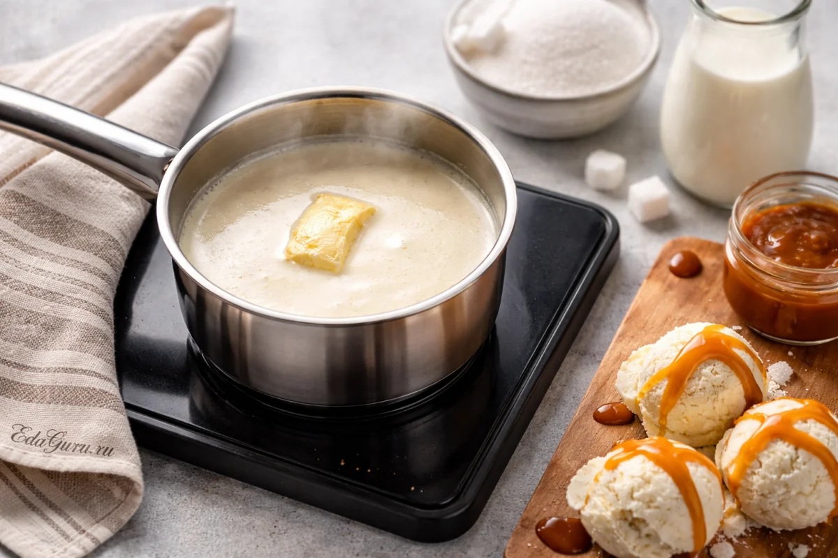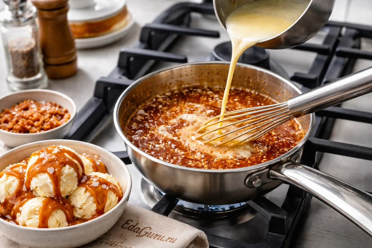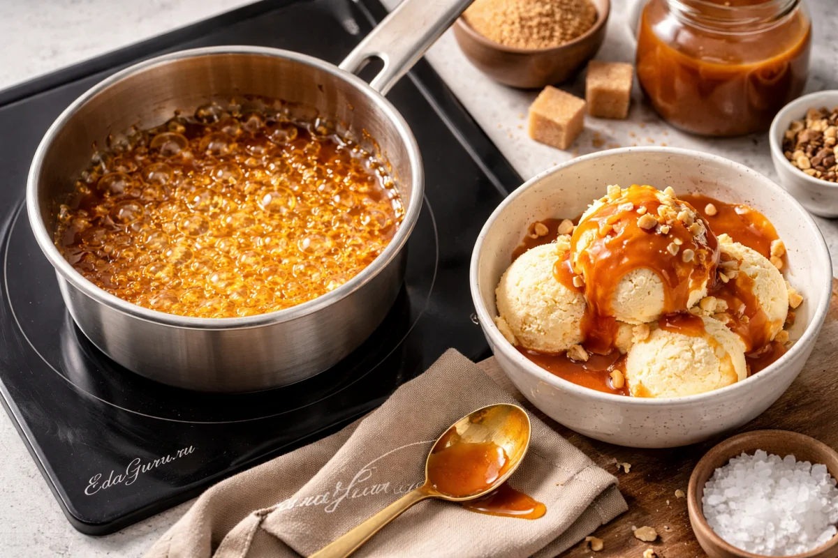 Для карамели особенно важно не передержать сахар: как только он стал глубокого янтарного цвета, сразу снимайте с огня, иначе появится горечь. Если хотите более мягкий вкус, часть сливок можно заменить молоком, но карамель будет менее густой; щепотка соли уместна, если нужен контраст и более яркий карамельный вкус.