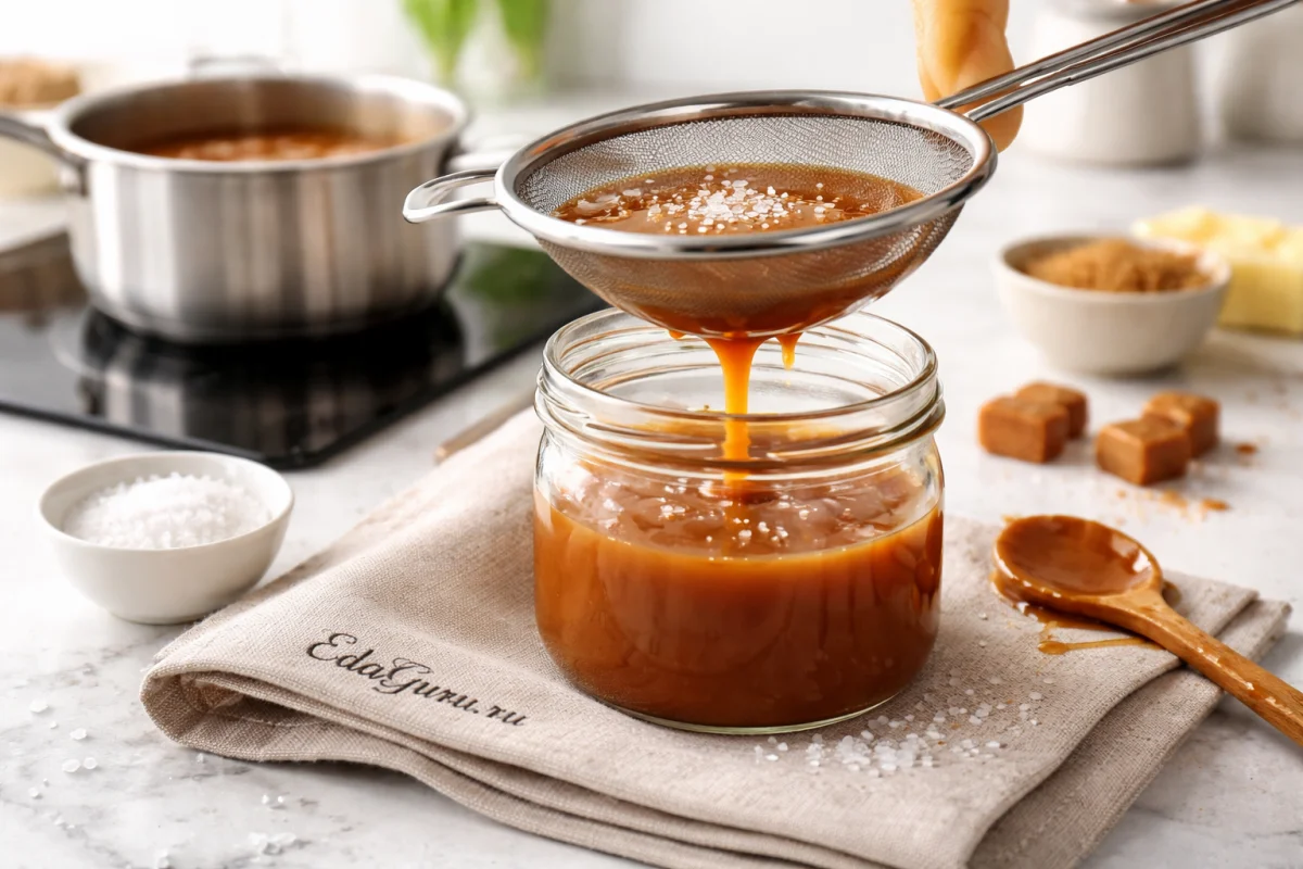 Готовую карамель пропустите через сито. Если хотите, вмешайте немного соли, после чего дайте ей остыть до комнатной температуры.