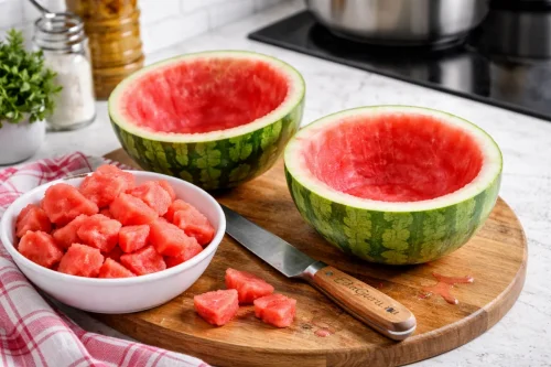 Арбуз разделите на две части. Осторожно извлеките мякоть, не нарушая целостность корки. Пустые половинки уберите в морозильник на 2 часа.