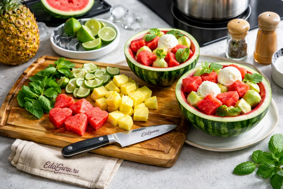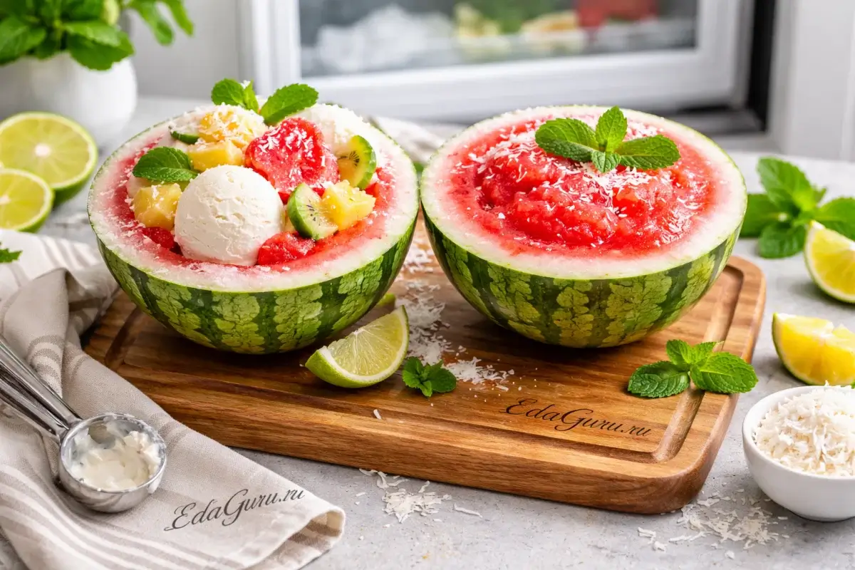 «Мороженое в арбузе» — эффектный летний десерт с простой идеей подачи: шарики мороженого раскладывают в половинки небольшого арбуза и дополняют свежей мякотью. Арбуз более чем на 90% состоит из воды, поэтому особенно популярен в жаркий сезон, а мороженое давно считается одним из самых узнаваемых летних десертов во многих странах. Сочетание сладкого арбуза с ананасом, лаймом и кокосом отсылает к тропическим вкусам: кислинка лайма делает подачу ярче, а кокосовая стружка добавляет текстуру. Такой вариант ценят не только за вкус, но и за внешний вид — натуральная арбузная «чаша» заменяет обычную посуду и делает десерт удобным для праздничной сервировки.
