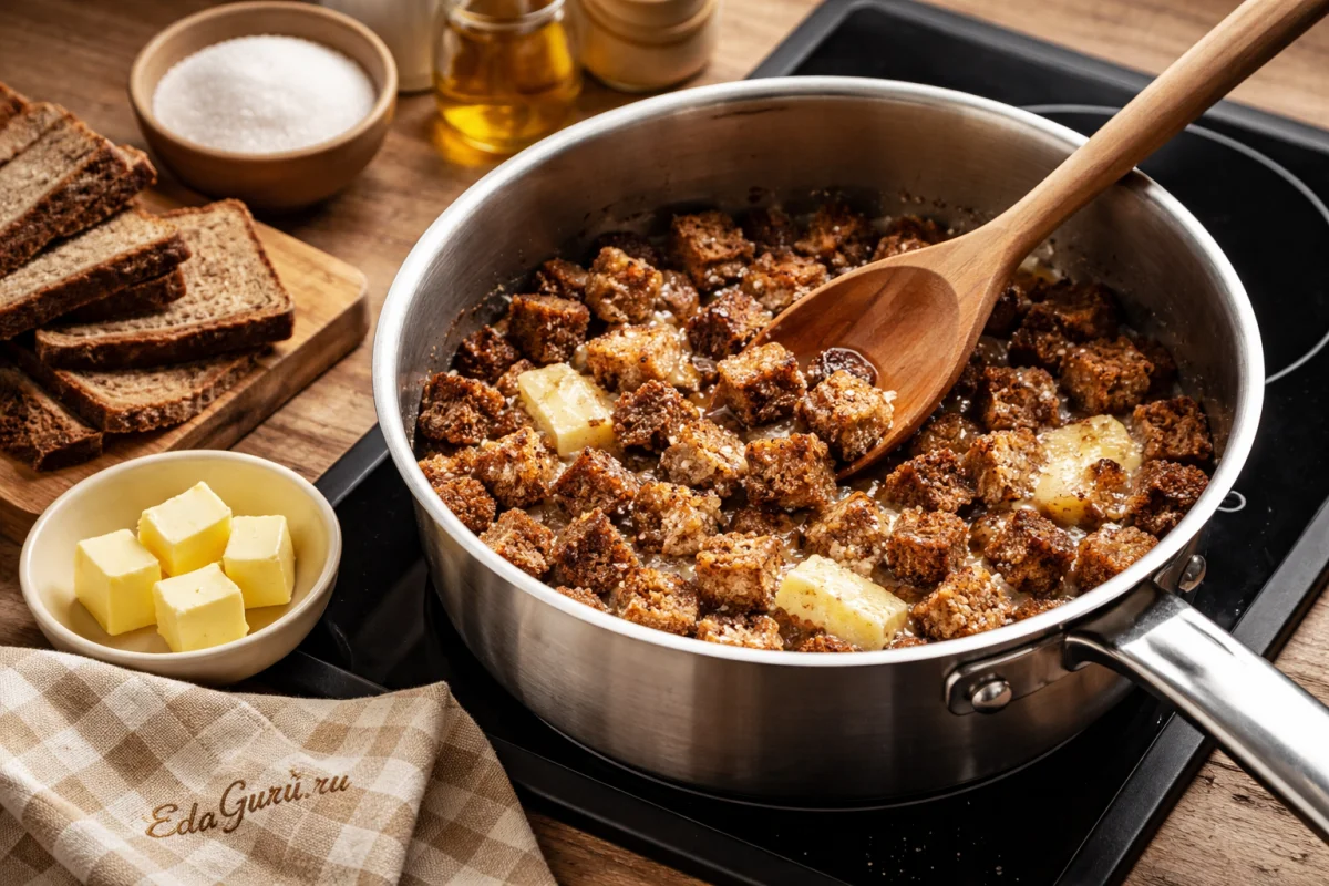 Готовим молоко с хлебным вкусом: переложите в сотейник сухари или ржаной хлеб, добавьте сливочное масло, затем сахар. Держите на среднем температуре, все время помешивая, пока масло с сахаром полностью не разойдутся, а хлеб не станет мягче. Следите, чтобы масса не подгорела. Если понадобится, влейте немного воды.