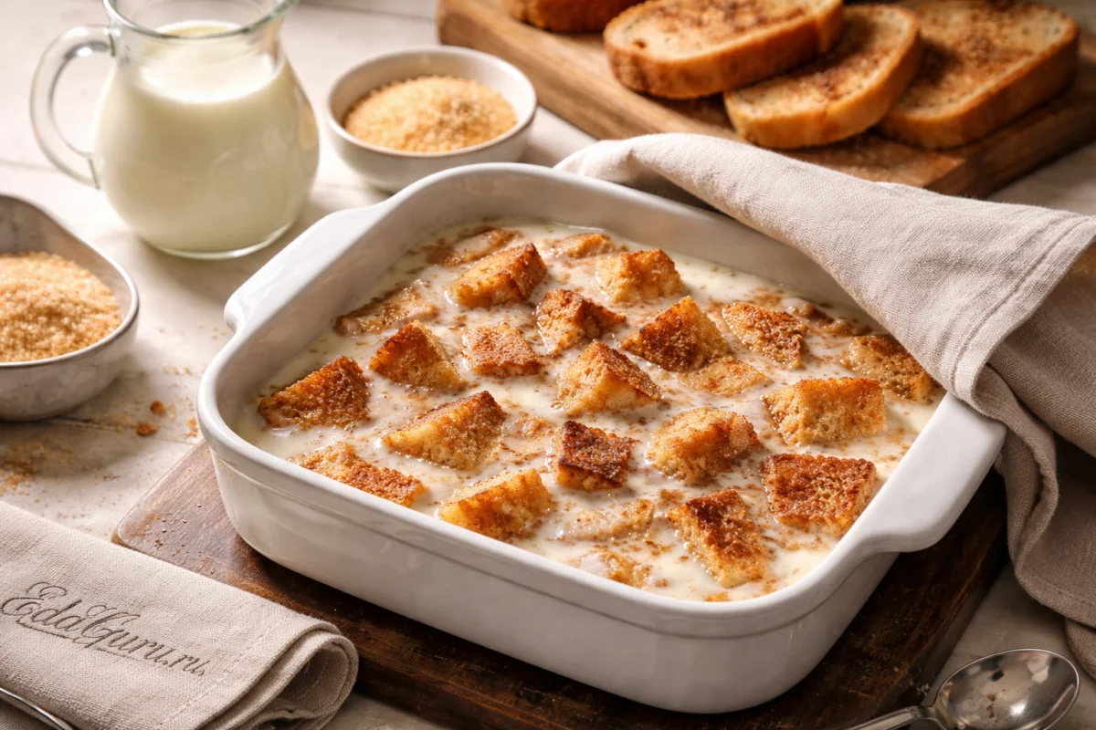 Переложите готовый обжаренный хлеб в молоко — предпочтительно с большим содержанием жира. Емкость закройте и поставьте в холодильник на три часа, а для более выраженного хлебного вкуса у молока оставьте на ночь.