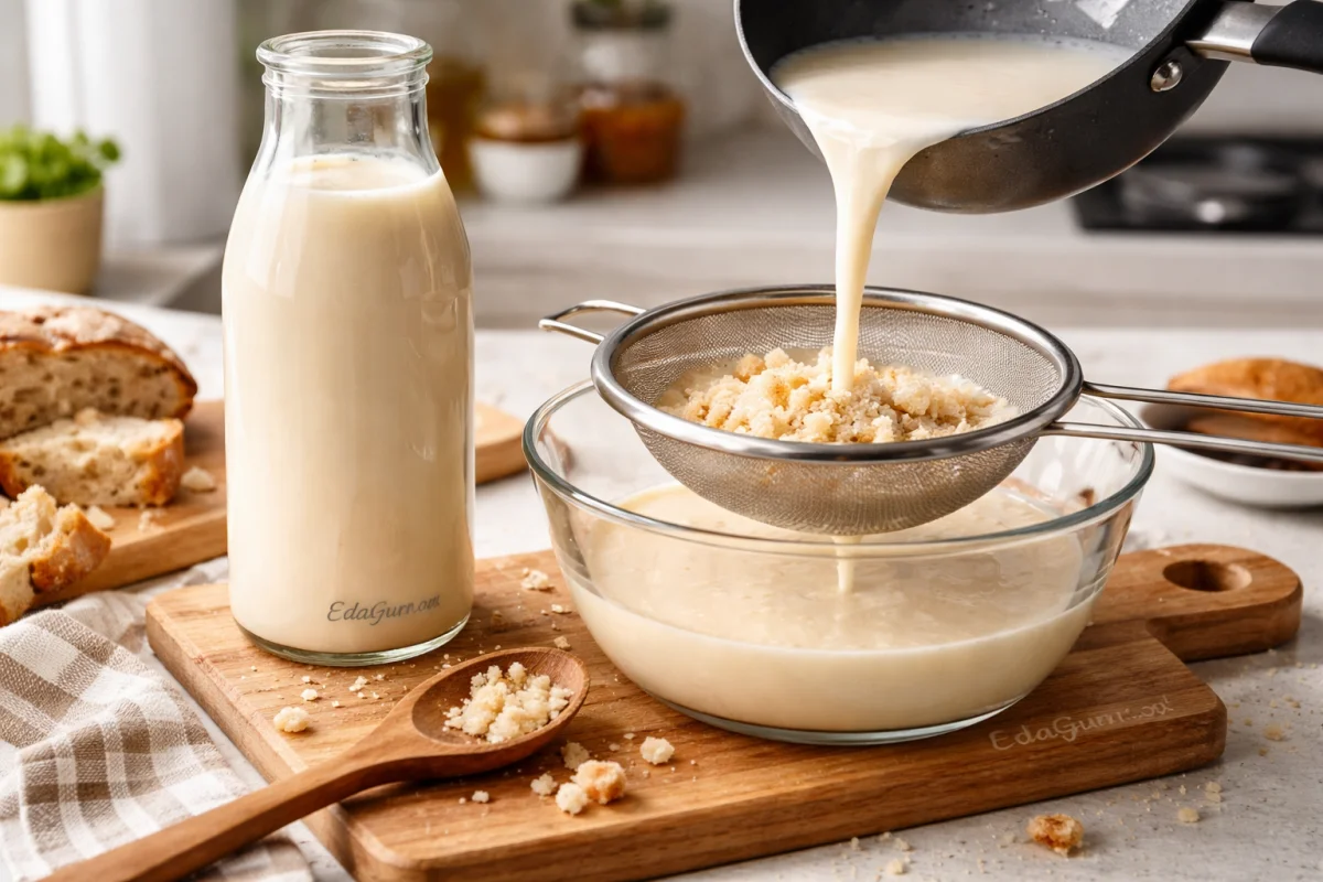 Выньте молоко из холодильника: к этому моменту оно должно стать коричневатого оттенка и получить хлебный аромат. Затем пропустите его через марлю, чтобы убрать оставшиеся кусочки хлеба.