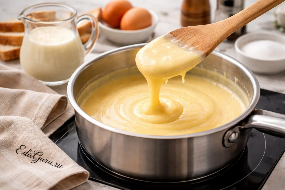 Далее сделайте крем. Отдельно разотрите до однородной массы 2 желтка, добавив к ним около сто г хлебного молока. Затем готовьте смесь на средней температуре, все время помешивая, пока она не станет густой. Правильная консистенция — когда крем держится на лопатке и не стекает с нее.