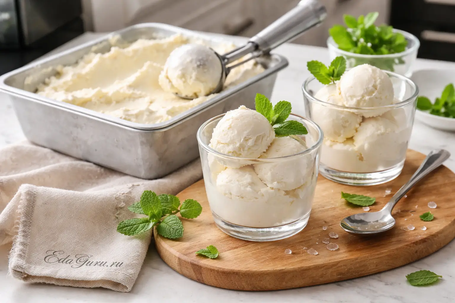 Переместите приготовленную смесь в емкость, подходящую для замораживания, и поставьте в морозильную камеру. Чтобы текстура получилась ровной и гладкой, доставайте мороженое и перемешивайте его через каждые 30 минут не менее трех раз.