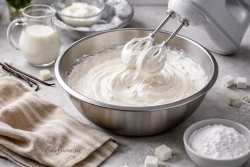 Переложите хорошо охлажденные сливки в заранее охлажденную емкость и взбейте их миксером.