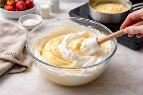 Вводите заварной крем к взбитым сливкам постепенно, за несколько раз, действуя осторожно. Затем лопаткой бережно перемешайте массу до равномерной консистенции, чтобы сливки сохранили свою пышность.