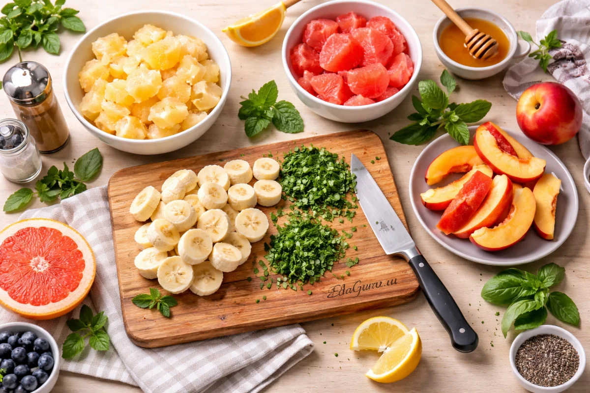 Банан порежьте на кусочки размером около 1–1,5 см. Помело разберите на сегменты, снимите с них белые оболочки и руками разделите на крупные части. У грейпфрута аккуратно извлеките мякоть, убирая все пленки. Нектарин или персик нарежьте дольками. Листья мяты и базилика мелко измельчите.