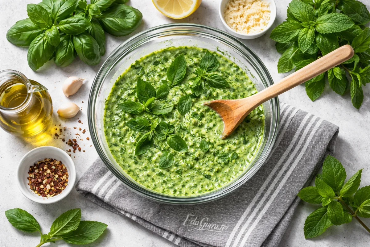 Соедините все компоненты соуса, затем вмешайте в смесь базилик и мяту.