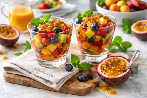 По креманкам или стаканчикам распределите подготовленные кусочки фруктов. Маракуйю разделите на две части, извлеките мякоть ложкой и выложите ее сверху. Затем полейте все соусом и сразу же подавайте десерт.