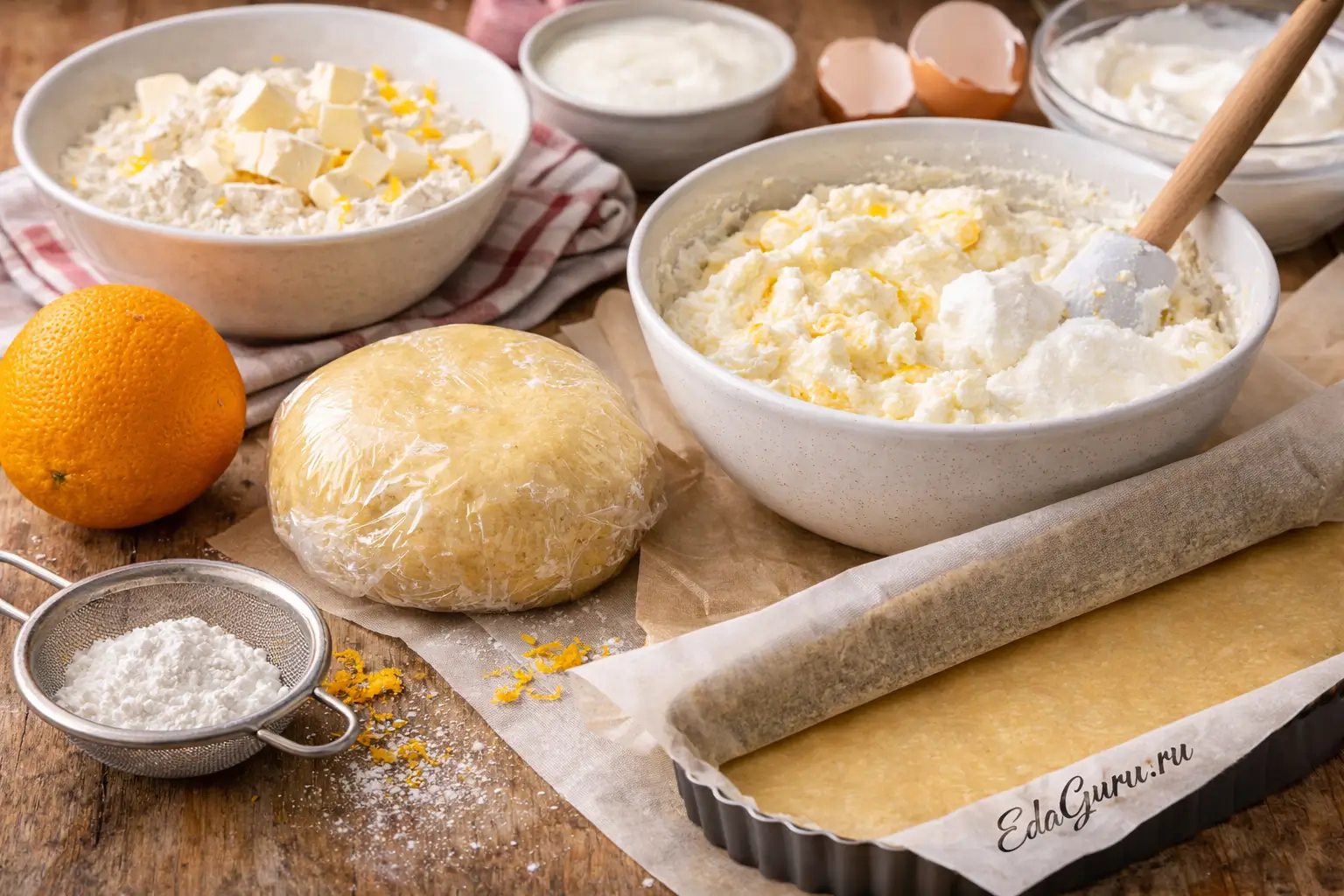 Соедините муку, заранее пропущенную через сито, с разрыхлителем, сливочным маслом, сливками и частью цедры. Замесите тесто, оберните его пленкой и поставьте в холодильник на 1 час. Затем разделите яйца на белки и желтки. Желтки разотрите с сахаром, творогом, оставшейся цедрой и крахмалом, после чего аккуратно вмешайте белки, взбитые до пены. Охлажденное тесто тонко раскатайте, поместив его между двумя листами пергамента, и перенесите в форму, смазанную маслом. Вылейте внутрь начинку, сверху распределите кусочки персиков. Выпекайте 45 минут при 200 °C. Готовый пирог украсьте ягодами, фруктами или орехами.
