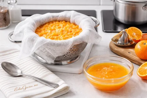 Дуршлаг выстелите марлей, сложив ее в два слоя, и переложите туда мандариновую смесь. Выжмите сок в миску. Для особенно прозрачного желе оставьте его ненадолго, чтобы он настоялся, затем снова процедите и отожмите.