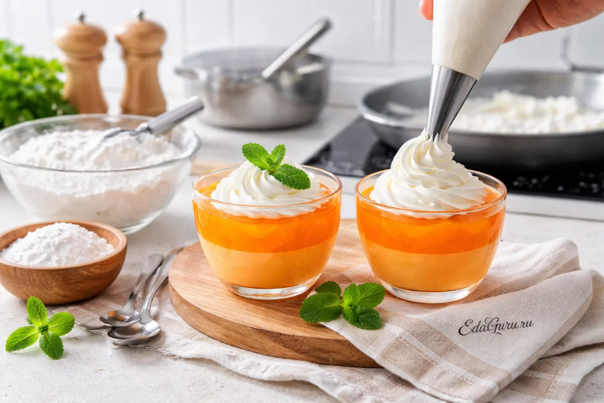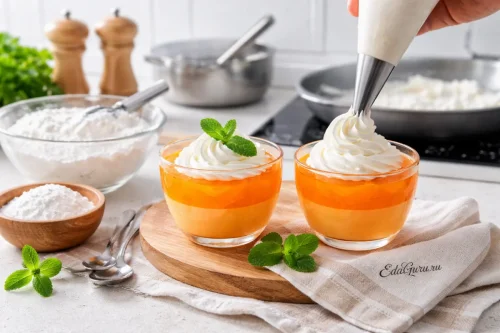 Сок не перегревайте после добавления желатина: достаточно слегка подогреть его, чтобы сахар растворился, иначе желе может хуже схватиться и потерять свежий цитрусовый вкус. Если мандаринов не хватает по соку, часть объема можно заменить апельсиновым соком — вкус станет мягче и менее ярким, а для более легкой подачи сливки можно заменить густым натуральным йогуртом.