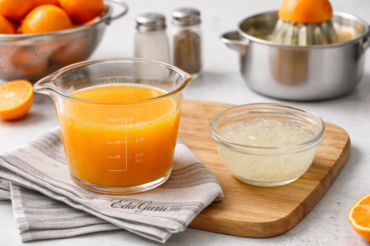 Добавьте 70 мл холодной воды в желатин, оставьте набухать. Затем измерьте объем мандариновой смеси: желательно, чтобы его было 400 мл. Если получилось меньше, добавьте сок другого цитруса или выжмите еще мандарины, чтобы довести количество до нужного.