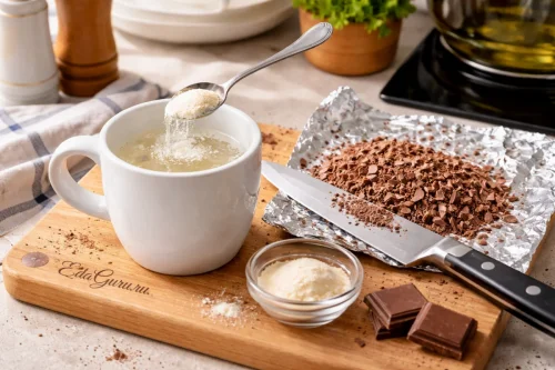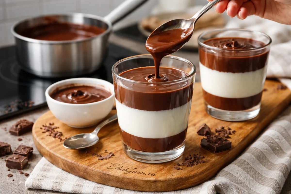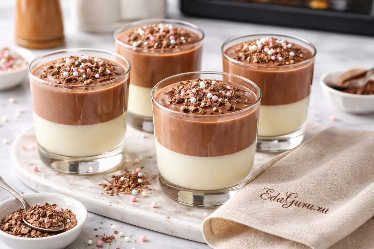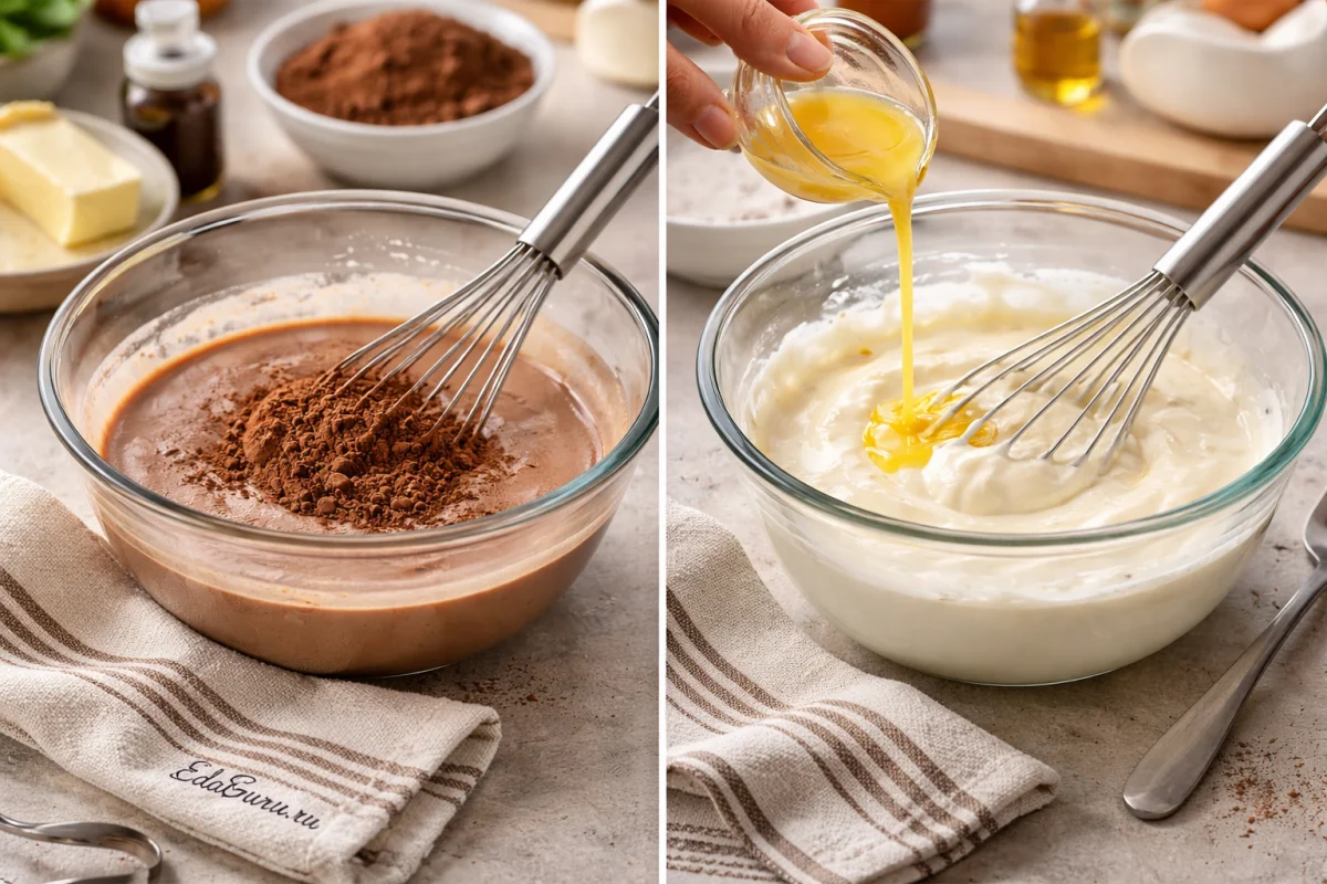 Для шоколадной части берите именно натуральный какао-порошок без сахара: он дает чистый вкус и ровный цвет, тогда как растворимые смеси делают текстуру менее однородной.