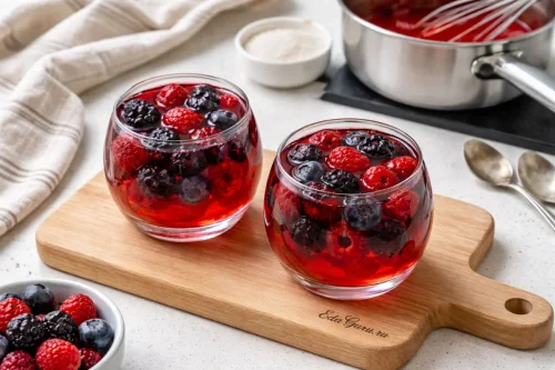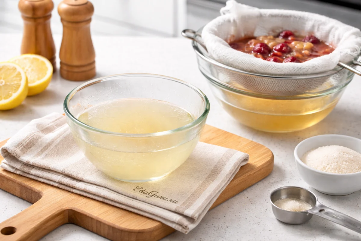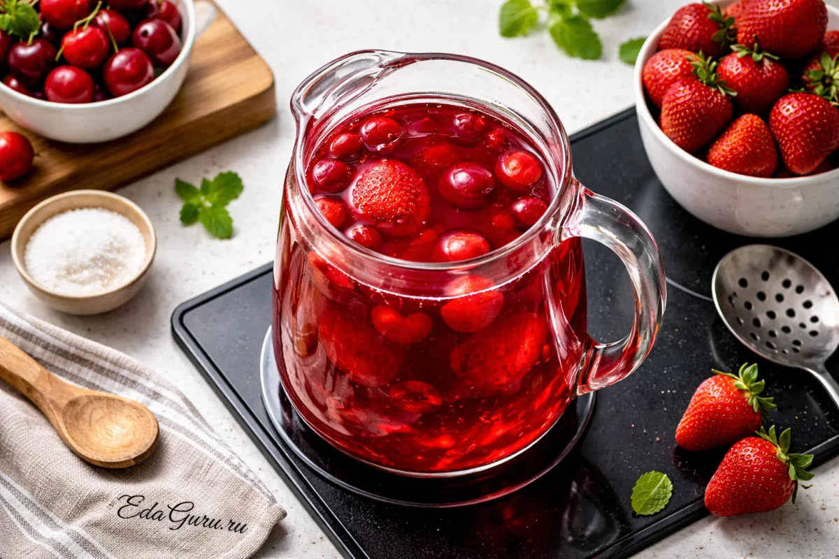 Желе из компота с желатином — простой холодный десерт, для которого удобно использовать домашний или магазинный компот. Основа рецепта предельно понятна: часть жидкости подогревают, растворяют в ней желатин, затем соединяют с остальным компотом и охлаждают до застывания. Желатин — натуральный желирующий продукт животного происхождения, который широко применяют в кулинарии для приготовления желе, муссов и заливных блюд. Такой способ особенно практичен, когда нужно переработать сладкие заготовки из ягод и фруктов. В отличие от киселя, где густоту дает крахмал, желе после охлаждения приобретает более плотную и упругую текстуру. Подавать его можно в креманках, стаканах или одной большой форме, а вкус десерта будет напрямую зависеть от выбранного компота: вишневого, яблочного, сливового или ягодного ассорти.