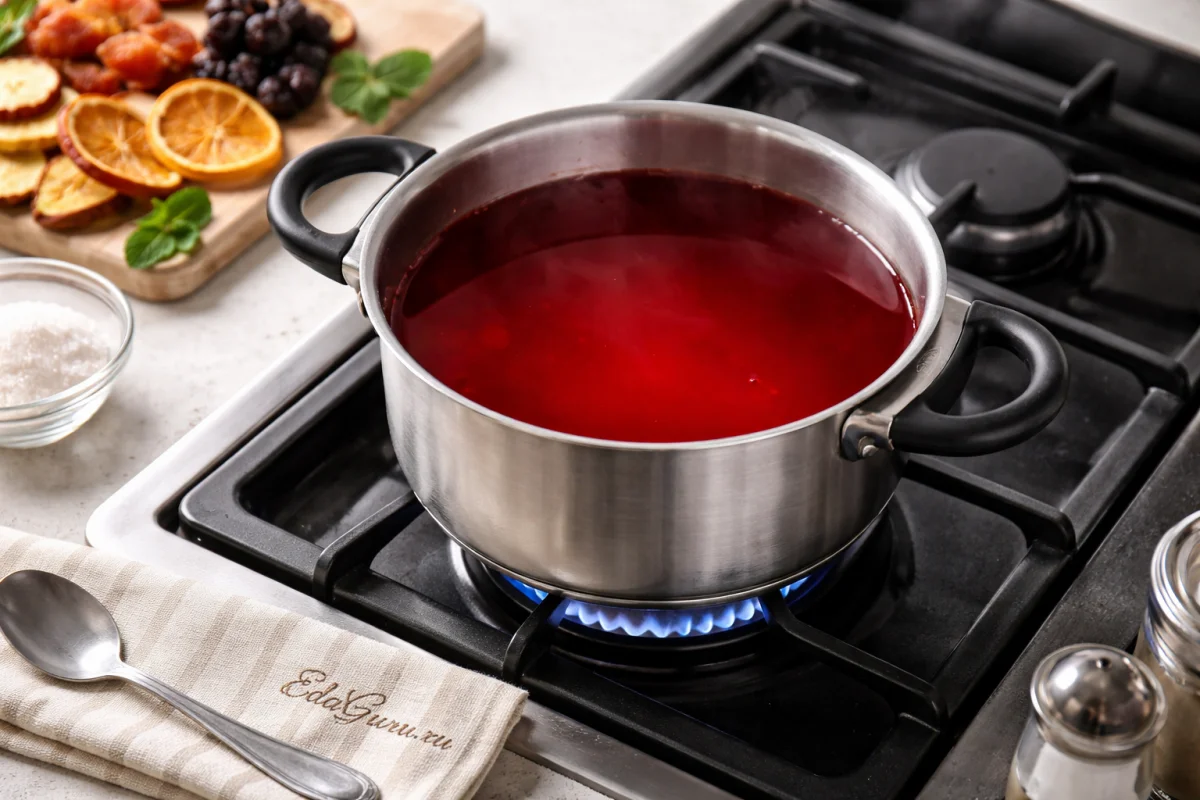 Кастрюлю с уже процеженным компотом верните на слабый огонь и прогрейте примерно до 50–60 °C. Кипятить не нужно: при закипании желатин утратит свои свойства.