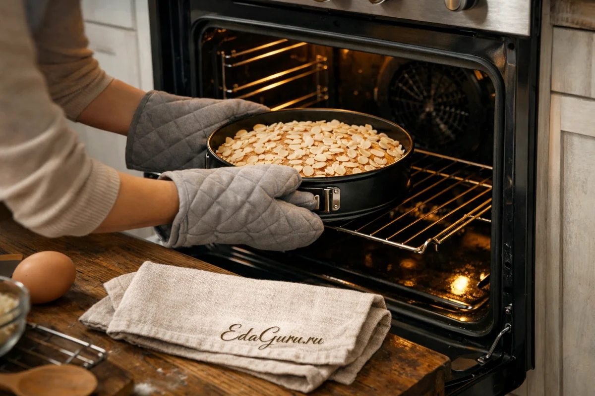 Поставьте форму в заранее прогретую до 180ºC духовку. Готовьте миндальный пирог около 40 минут, но следите за ним: в некоторых духовках он может испечься немного раньше.