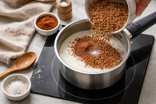 Гречку перед варкой лучше хорошо промыть: вкус будет чище, а каша — менее вязкой; какао удобнее сначала размешать в небольшом количестве холодного молока, чтобы в сотейнике не было комков.