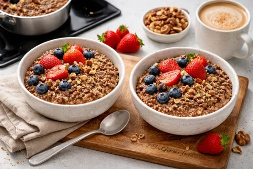 Гречка с ягодами и какао — необычное, но вполне логичное сочетание. У обжаренной гречневой крупы яркий ореховый вкус, а какао добавляет блюду глубокий шоколадный аромат без лишней сладости. Такой вариант можно подать как теплую кашу на завтрак или как простой десерт, если дополнить молоком, медом, сахаром или фруктами. Гречка давно занимает важное место в кухнях России и Восточной Европы, а какао пришло в европейскую гастрономию из Центральной Америки, где его использовали задолго до появления привычных шоколадных десертов. Сегодня эти продукты нередко соединяют в домашних рецептах, когда хочется приготовить что-то сытное и оригинальное из доступных ингредиентов. Гречка с какао подходит тем, кто любит новые вкусовые сочетания и простые блюда на каждый день.