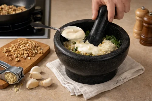 Очистите чеснок и пропустите его через чеснокодавилку, а орехи измельчите. В глубокой тарелке соедините йогурт, майонез, базилик, сыр, чеснок и орехи, затем перемешайте до однородности. Посолите.