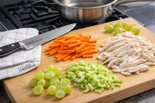 Курицу нарежьте тонкими ломтиками. Сельдерей сначала промойте, затем тонко порежьте. Морковь очистите и нарежьте маленькими кусочками. Несколько виноградин отложите для украшения салата, а остальные разрежьте пополам и удалите косточки.