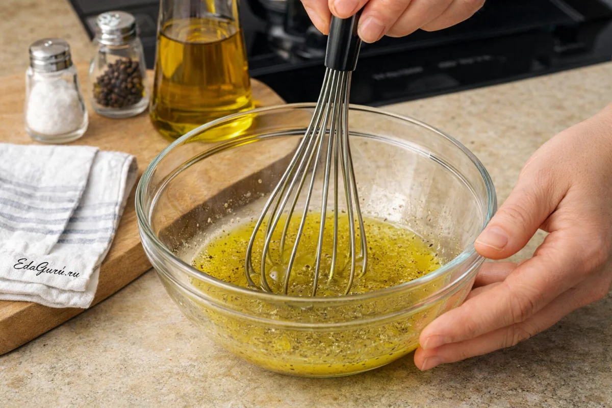 Сначала приготовьте заправку: хорошо взбейте оливковое масло с уксусом, затем добавьте соль и перец по вкусу. Важно добиться однородной эмульсии, чтобы заправка получилась более сбалансированной на вкус.
