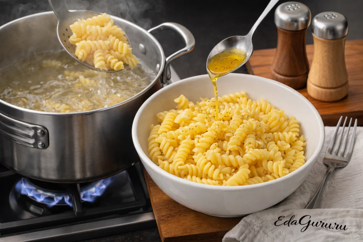 Сварите макароны, ориентируясь на время и способ приготовления, указанные на упаковке. Пока они остаются горячими, переложите их в емкость и добавьте одну ст. л. заправки. Так они не слипнутся и лучше впитают вкус.