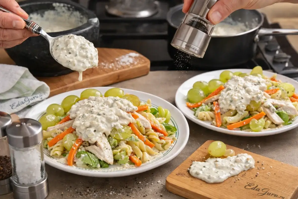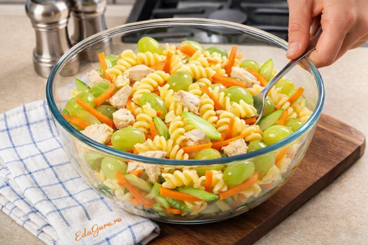 Заменить спирали можно на перья или бантики. Виноград добавляет салату важный вкусовой контраст: сладость ягод хорошо сочетается с солоноватой курицей и пикантной заправкой. Лучше использовать зеленый виноград без косточек — он менее сладкий.