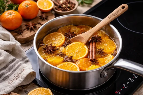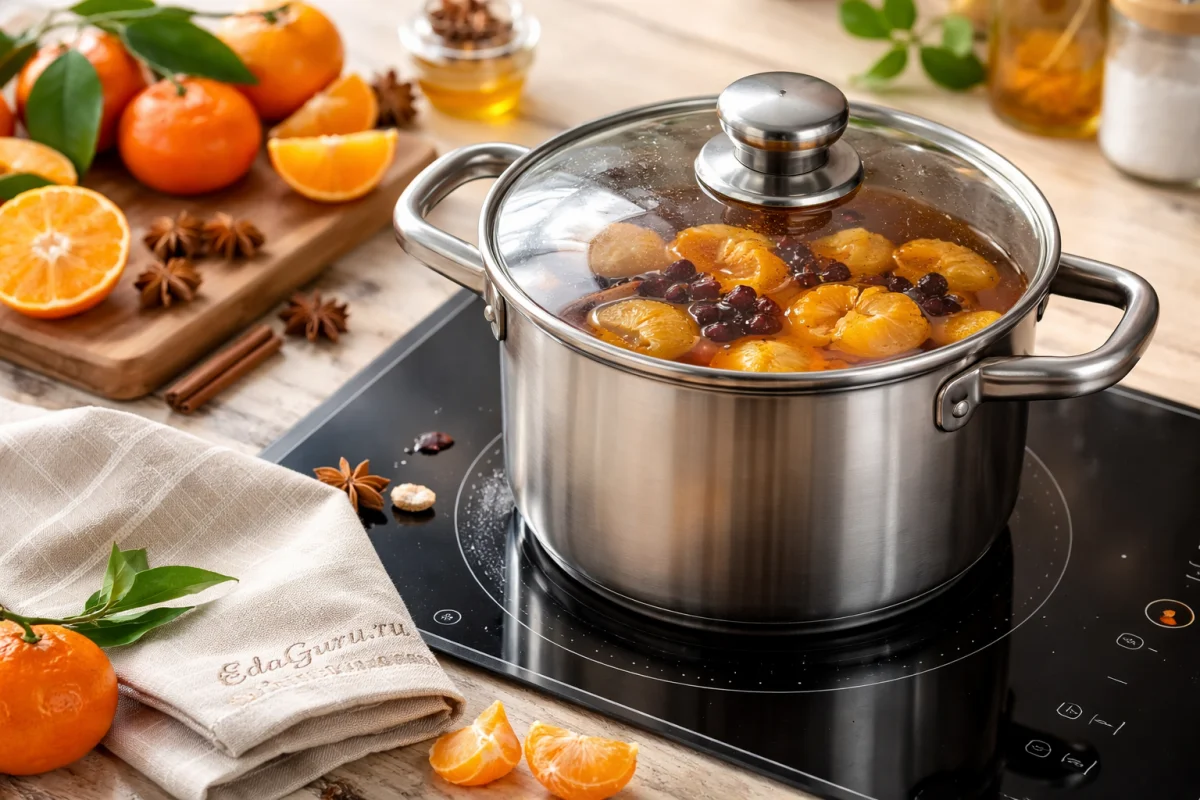 Уберите кастрюлю с плиты, плотно закройте ее и дайте напитку постоять не меньше 30–40 минут. За это время дольки мандаринов успеют напитаться сиропом, сохранив плотную текстуру, а пряности полностью раскроют свой запах. Именно после такого настаивания вкус компота становится глубоким и гармоничным.