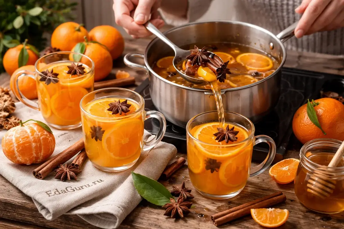 Компот из мандаринов — простой домашний напиток, который особенно уместен зимой, когда цитрусовые доступны и ароматны. Его готовят не для длительного хранения, а сразу к столу: при нагревании цедра и мякоть отдают воде характерный свежий запах и мягкую сладость. Мандарины относятся к цитрусовым, которые пришли в Европу из Азии, а в России прочно ассоциируются с зимним сезоном и новогодним столом еще с советского времени, когда именно эти фрукты стали одним из главных символов праздника. В горячем компоте вкус этих фруктов раскрывается особенно мягко, а пряности вроде бадьяна или корицы лишь подчеркивают его, не перебивая цитрусовую основу.