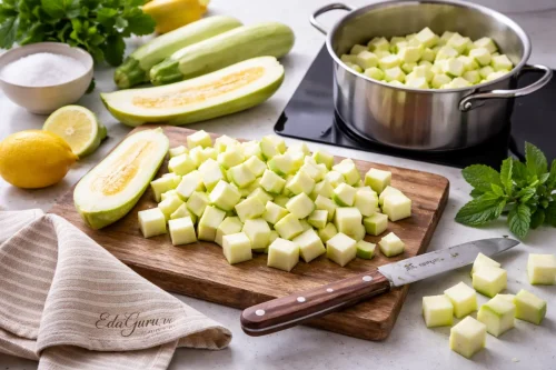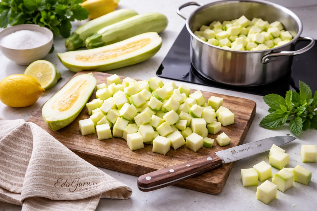 Для компота подойдут и молодые, и зрелые кабачки. Сначала снимите с них кожицу, затем разрежьте каждый плод вдоль на две части и уберите мягкую середину вместе с семенами. После этого нарежьте мякоть кубиками размером примерно 1,5 см.