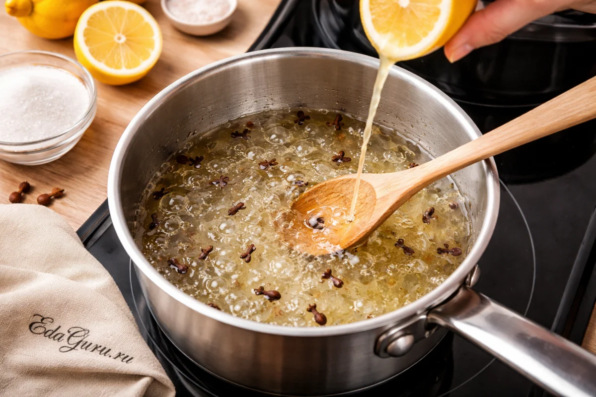 Всыпьте в воду сахар и нагрейте до закипания. Затем введите лимонный сок и бутоны гвоздики. Готовьте примерно 3 минуты, непрерывно помешивая, пока сахар полностью не растворится.