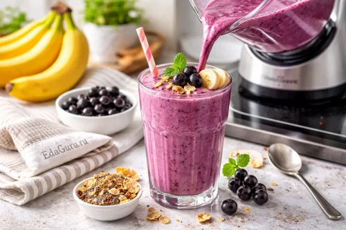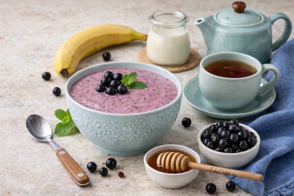 Смузи со смородиной — простой безалкогольный напиток с ярким вкусом и естественной кислинкой. Для его приготовления часто используют черную или красную смородину, а в качестве основы хорошо подходит ряженка: она придает напитку мягкую кремовую текстуру и характерный кисломолочный вкус. Смородина ценится за высокое содержание витамина C, особенно черная, поэтому такие смузи нередко выбирают для домашнего меню как более полезную альтернативу сладким газированным напиткам. Сам формат смузи стал особенно популярным во второй половине XX века, когда в США и Европе распространилась культура фруктово-ягодных коктейлей. Перед подачей напиток обычно хорошо охлаждают, чтобы вкус смородины раскрывался ярче.
