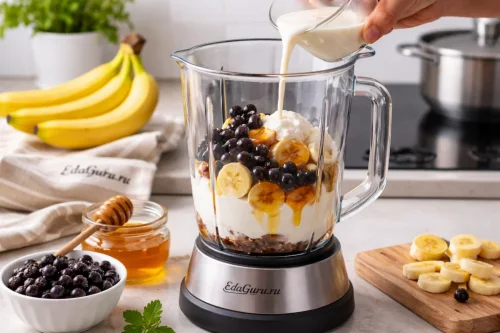 В чашу блендера сначала отправьте смородину с бананом и мёдом, затем влейте ряженку.