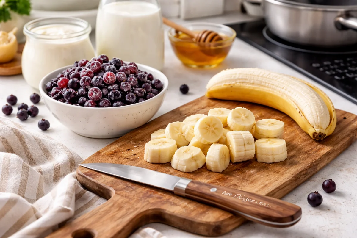 Замороженной смородине дайте немного оттаять. С банана снимите кожуру и порежьте его на небольшие кусочки.