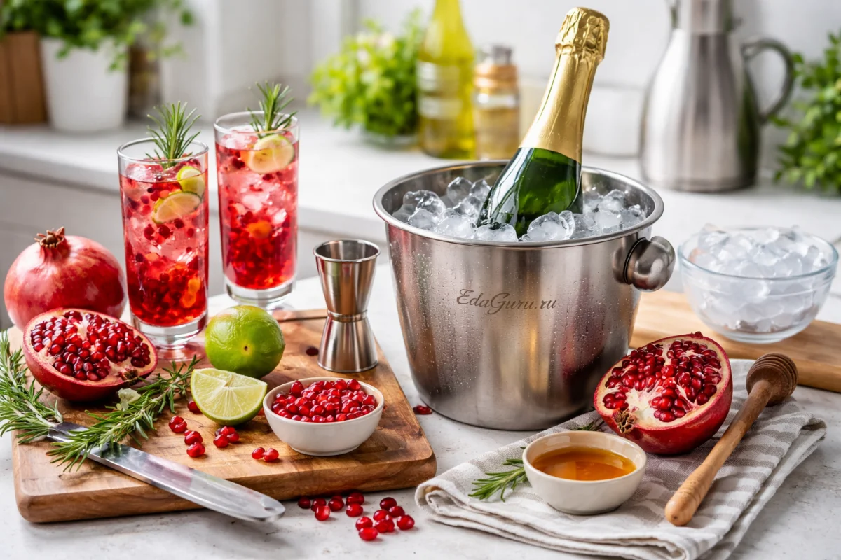 Заранее соберите все необходимые продукты и посуду для коктейля «Гранатовый взрыв», а безалкогольное игристое уберите охлаждаться.