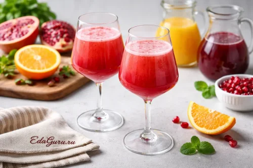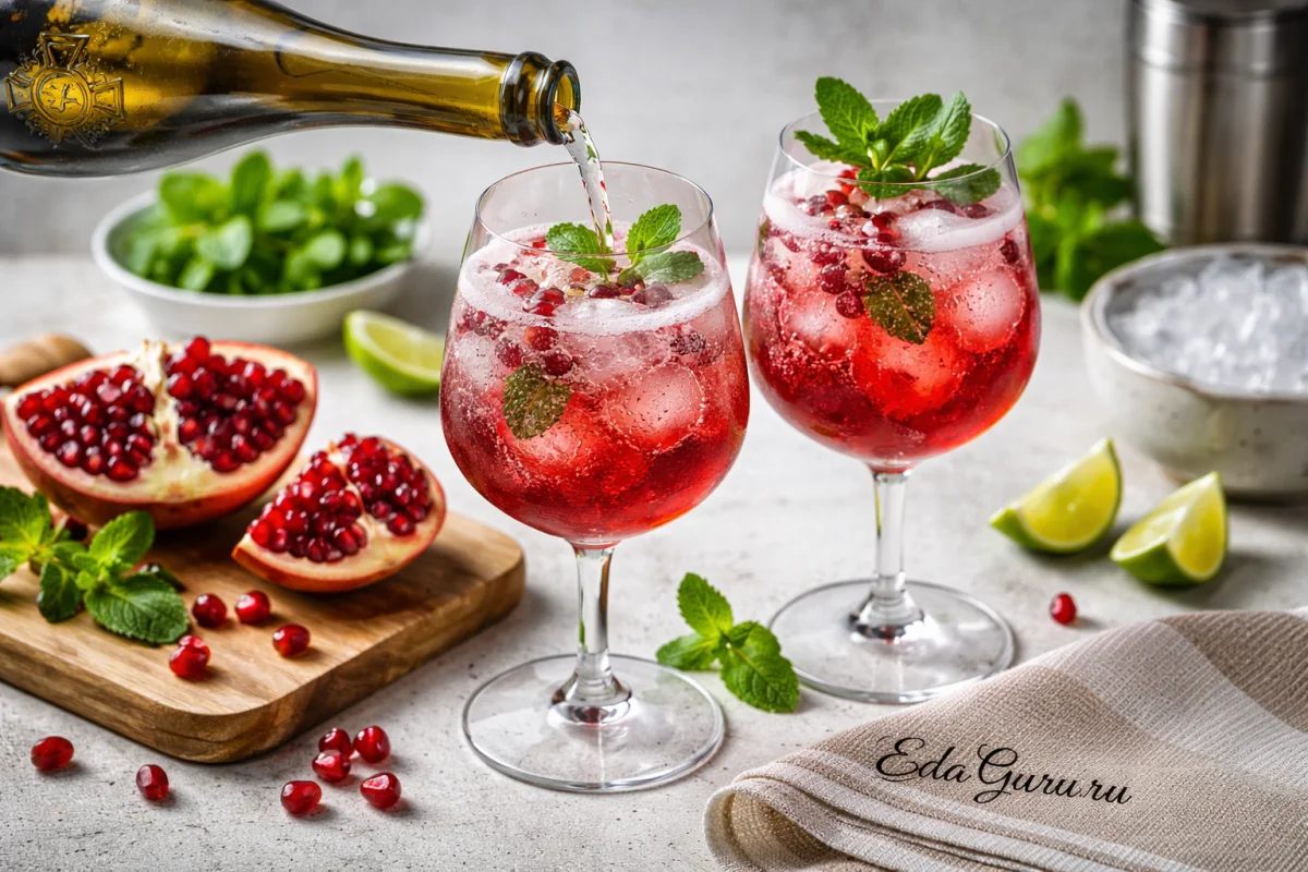 Все ингредиенты и бокалы лучше хорошо охладить заранее: так коктейль останется ярким и шипучим без добавления льда, который быстро разбавит вкус. Игристое вливайте в самом конце и аккуратно по стенке бокала, не перемешивая, чтобы сохранить пузырьки и легкую текстуру. Если гранатовый сок слишком терпкий, часть апельсинового можно заменить на красный виноградный сок — вкус будет мягче и слаще; мяту перед подачей слегка разомните в ладонях, чтобы аромат стал заметнее.