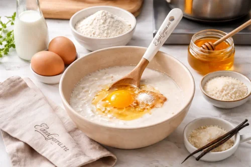 Соедините рисовую муку с молоком и дайте массе постоять 10 минут, чтобы она набухла. После этого введите яйцо, мед и ванилин, затем тщательно размешайте.