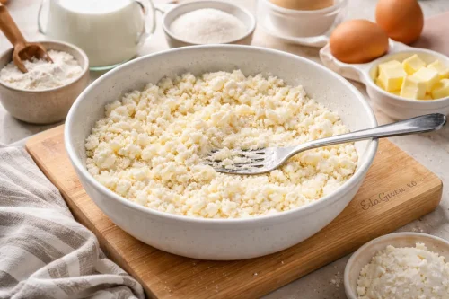 Возьмите сухой, рассыпчатый творог, соедините его с подготовленной смесью из муки и тщательно разомните вилкой, чтобы масса стала однородной.
