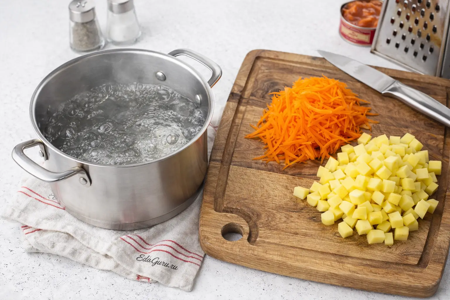 Налейте полтора литра воды в кастрюлю и поставьте на плиту, чтобы довести до кипения. В это время займитесь овощами. Хорошо промойте морковь и картофель, затем очистите. Морковь потрите на терке крупного размера, картофель порежьте на небольшие кусочки. Это позволит овощам равномерно приготовиться в борще.