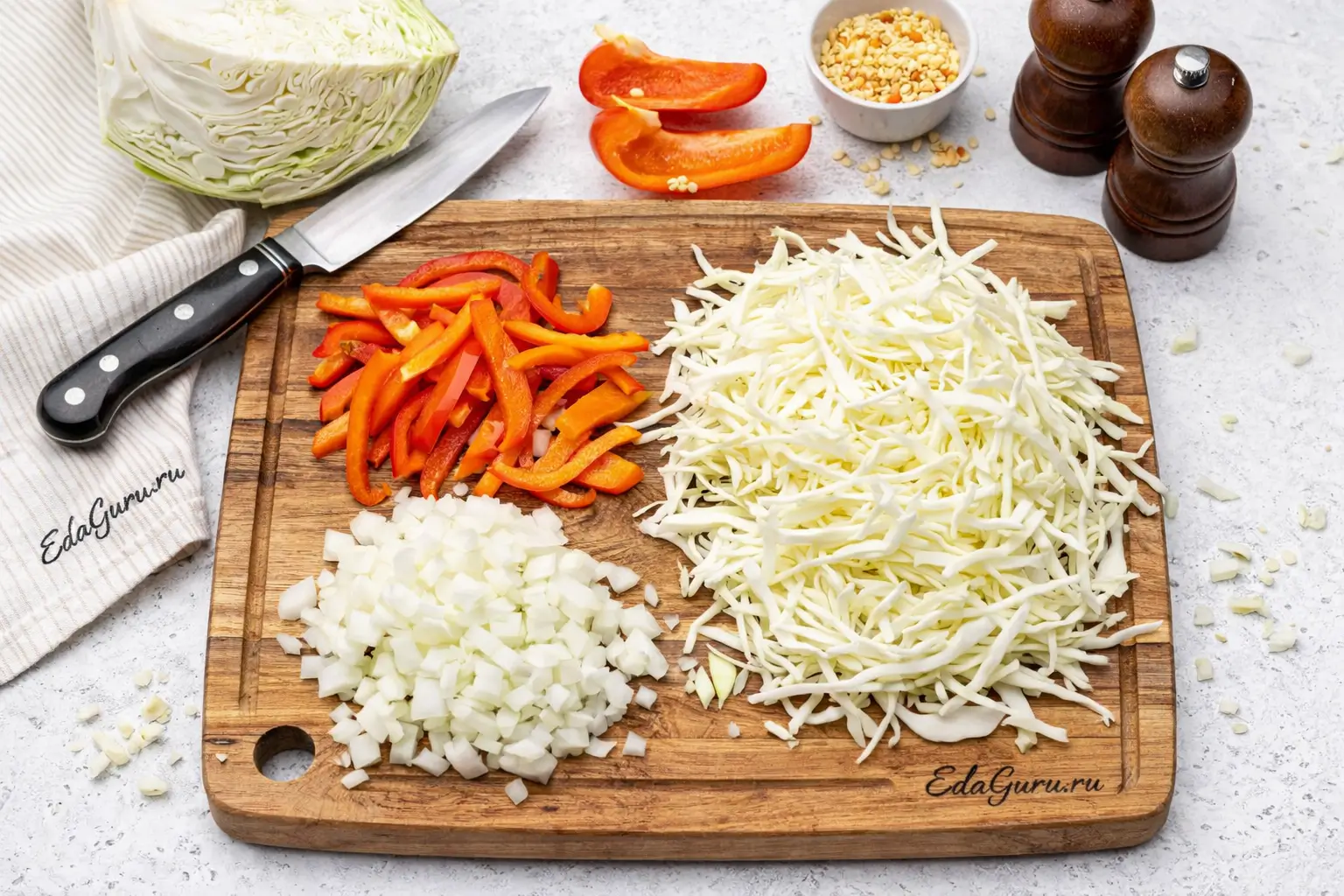 Тонко нашинкуйте капусту, лук почистите и нарежьте небольшими кубиками. Сладкий перец очистите от сердцевины и семян, затем разрежьте на четыре части вдоль и нарежьте их соломкой.