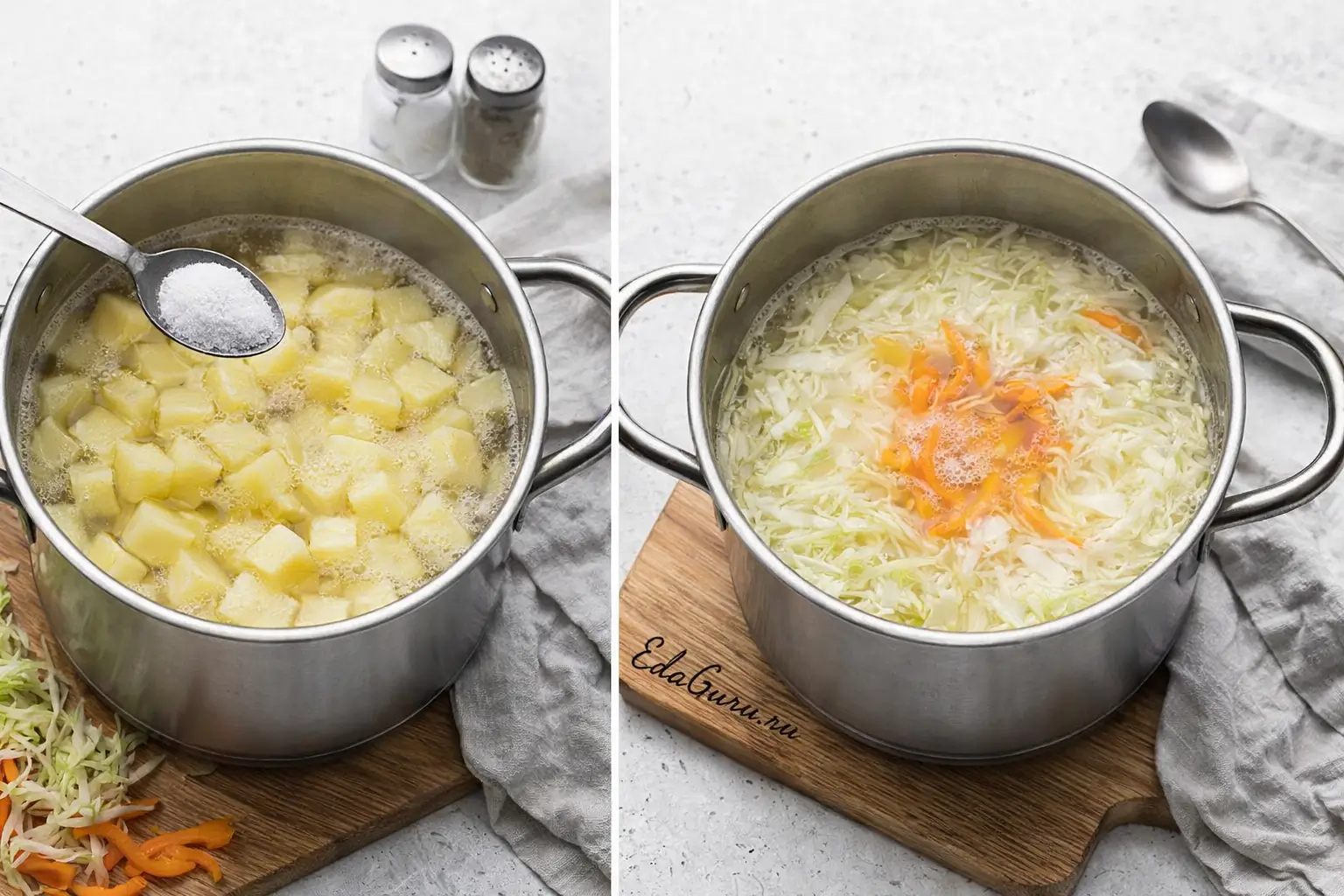 Опустите нарезанный картофель в кастрюлю с кипящей водой. Как только вода закипит вновь, добавьте соль в количестве 1 чайной ложки и варите картофель в течение пяти минут. Затем положите в кастрюлю нашинкованную капусту и кусочки сладкого перца.