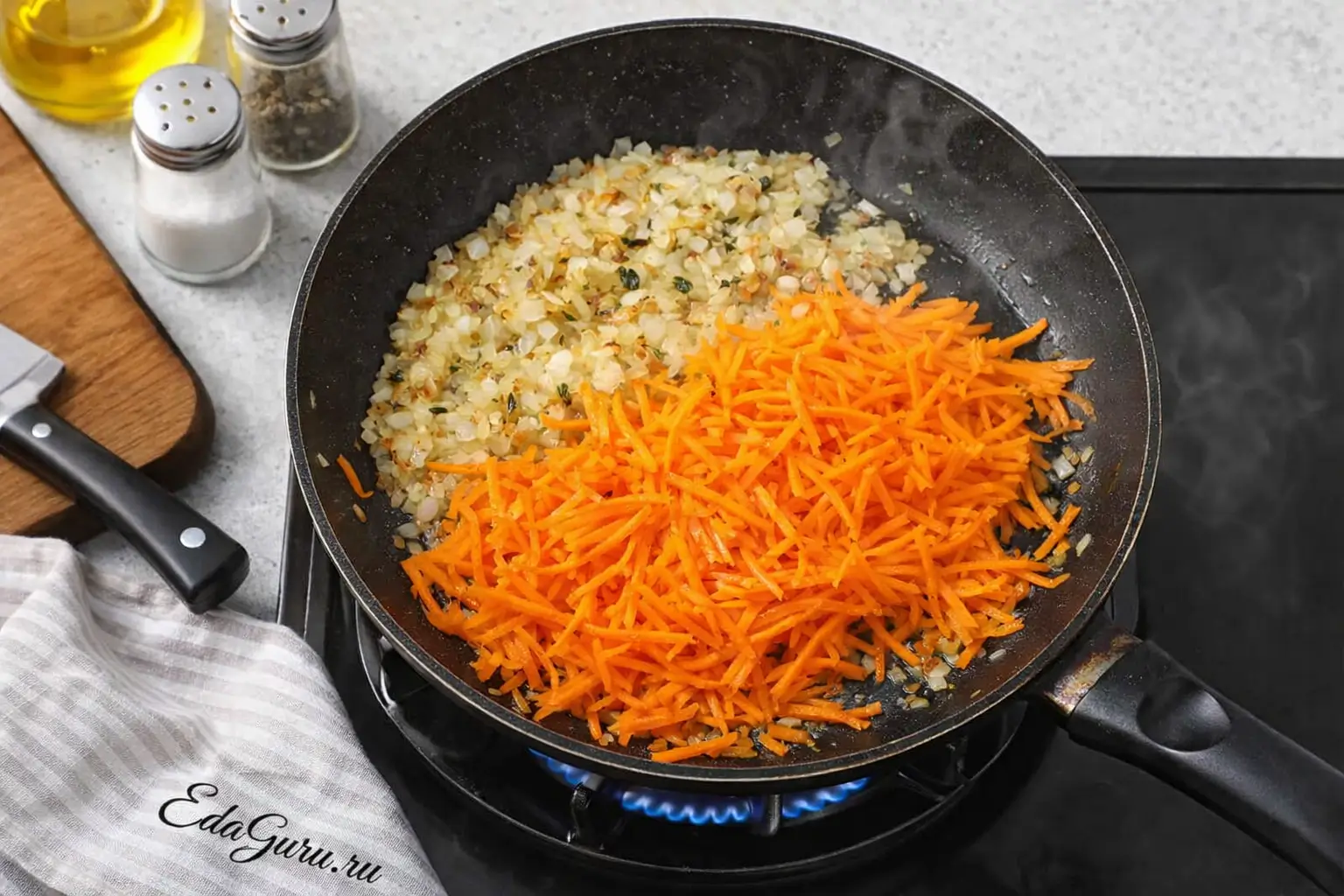 Поставьте сковороду на плиту и налейте в нее растительное масло, чтобы оно нагрелось. Добавьте лук и готовьте его, помешивая, в течение 5 минут. После этого морковь и продолжайте обжаривать еще 5 минут. Следите, чтобы овощи не подгорели, а равномерно подрумянились.