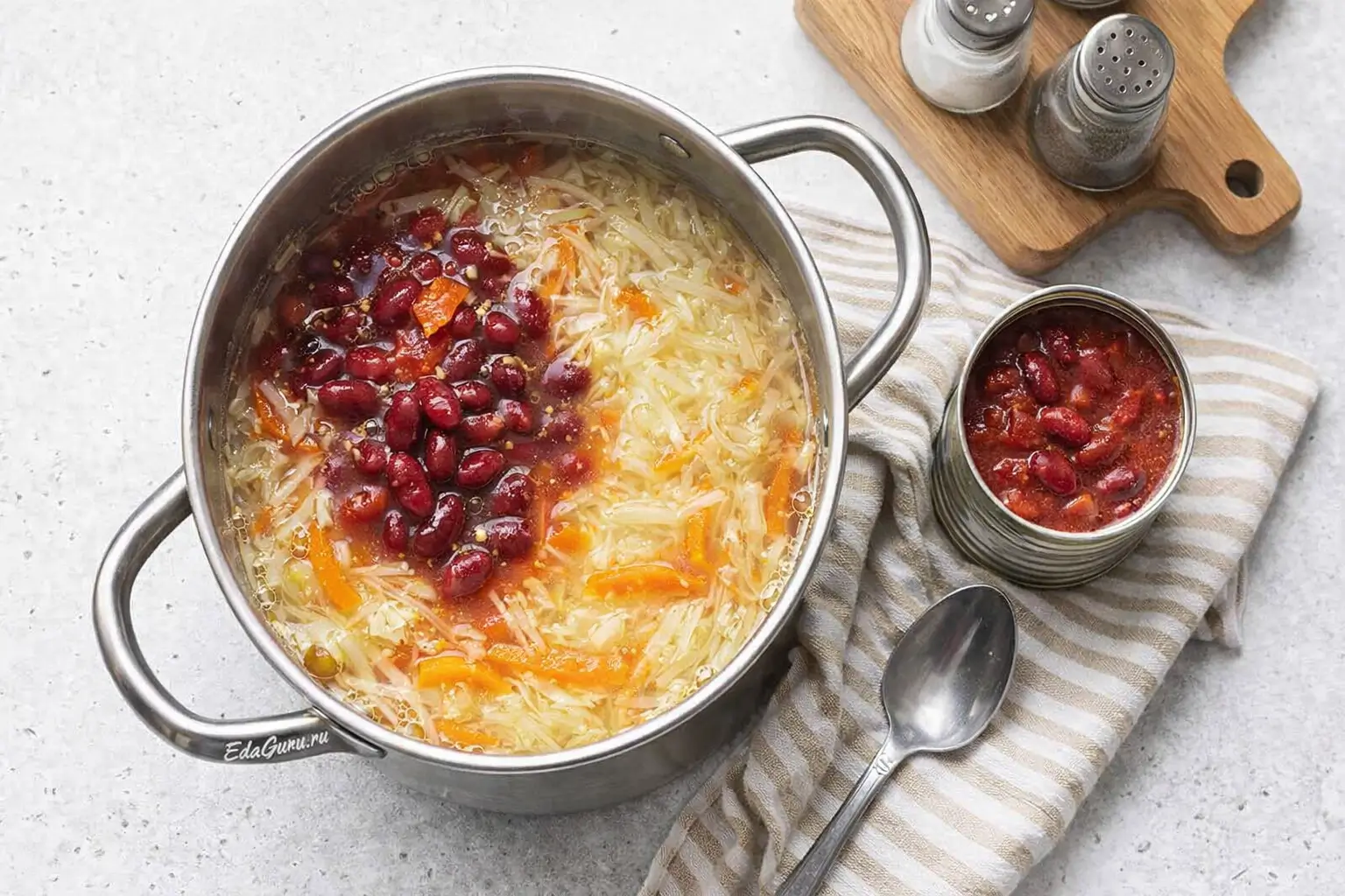 Через пять минут после того, как вы добавили в кастрюлю капусту и сладкий перец, положите в суп консервированную красную фасоль, предварительно слив жидкость. Если фасоль в томатном соусе, добавляйте вместе с ним. Это придаст борщу насыщенный вкус и аромат.