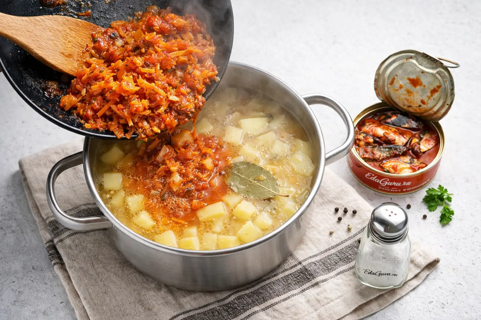 В готовый картофель добавьте в кастрюлю обжаренные овощи и лавровый лист. После этого добавьте кильку в томатном соусе. Не забудьте, что лавровый лист следует достать перед подачей.