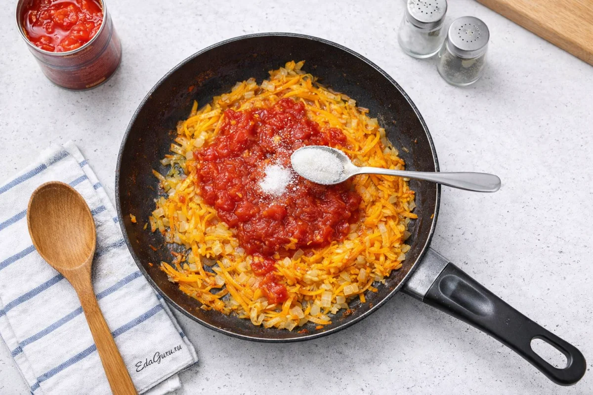 К обжаренным овощам добавьте нарезанные консервированные помидоры и готовьте их около пяти минут. Добавьте 1 чайную ложку сахара для уменьшения кислотности.