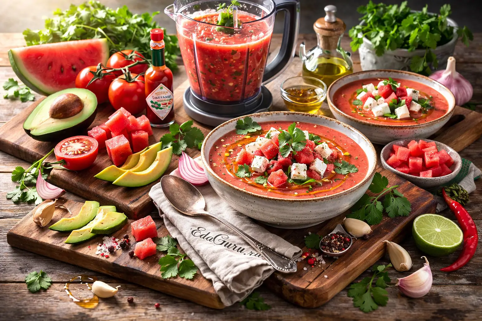 Гаспачо с арбузом — современная вариация испанского холодного супа. Классический гаспачо происходит из Андалусии: его готовят из сырых овощей, чаще всего из помидоров, с добавлением оливкового масла, уксуса, соли и хлеба. Блюдо особенно популярно в жаркое время года благодаря освежающему вкусу и подаче в охлаждённом виде. Версия с арбузом появилась как сезонная интерпретация классики. Арбуз хорошо сочетается с томатами, огурцом и сладким перцем, добавляя супу естественную сладость и более лёгкую текстуру. Как и традиционный гаспачо, такой вариант подают очень холодным, иногда с кубиками овощей, зеленью или каплей оливкового масла. Этот рецепт ценят за простоту: ингредиенты не требуют варки, а вкус строится на свежести продуктов. Гаспачо с арбузом подходит для летнего обеда или лёгкой закуски.