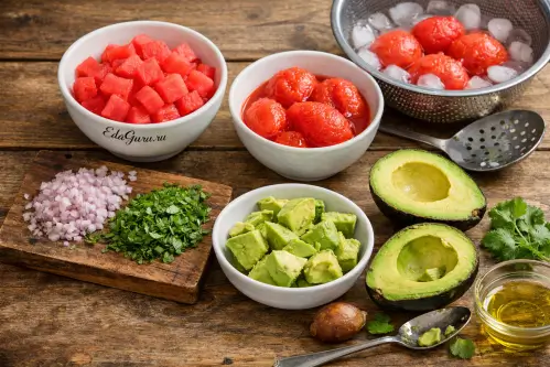 100 г арбуза нужно оставить, он понадобится для подачи. Помидоры по очереди опустите в кипяток, затем быстро обдайте холодной водой, после чего снимите кожицу и уберите семена. Кинзу и шалот измельчите, оставив 2–3 веточки кинзы для украшения. Авокадо разрежьте на половинки, удалите косточку и ложкой аккуратно достаньте мякоть.