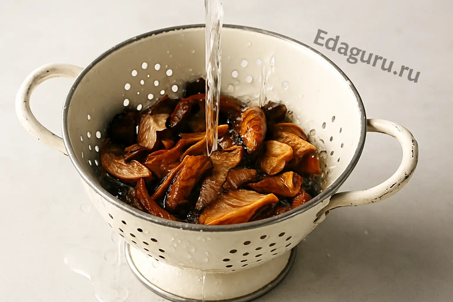 Используя шумовку, выловите грибы из воды. Затем аккуратно слейте жидкость, оставляя возможный осадок на дне. Этот грибной настой пригодится для приготовления бульона.